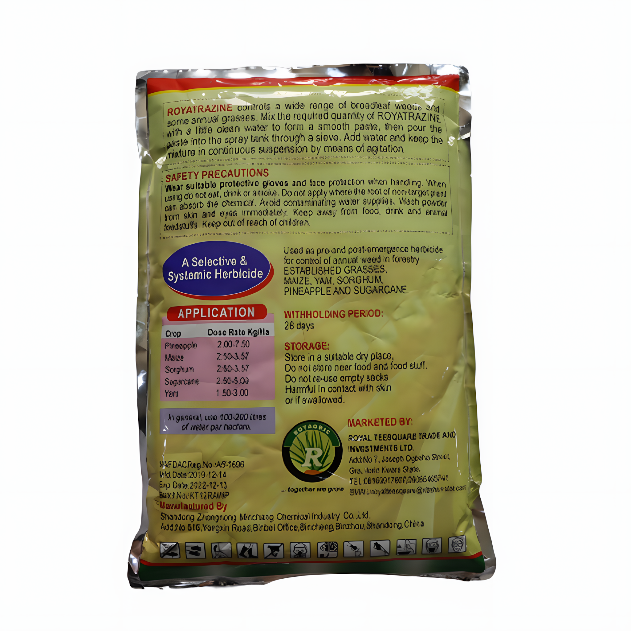 Uses: Pre-emergence weed control in maize, sorghum, sugarcane, yam, and cassava.